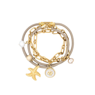 Handgefertigt in Deutschland, 14K vergoldet. Halbedelsteine, Muschel- und Süßwasserperlen. Handgenähtes italienisches Leder