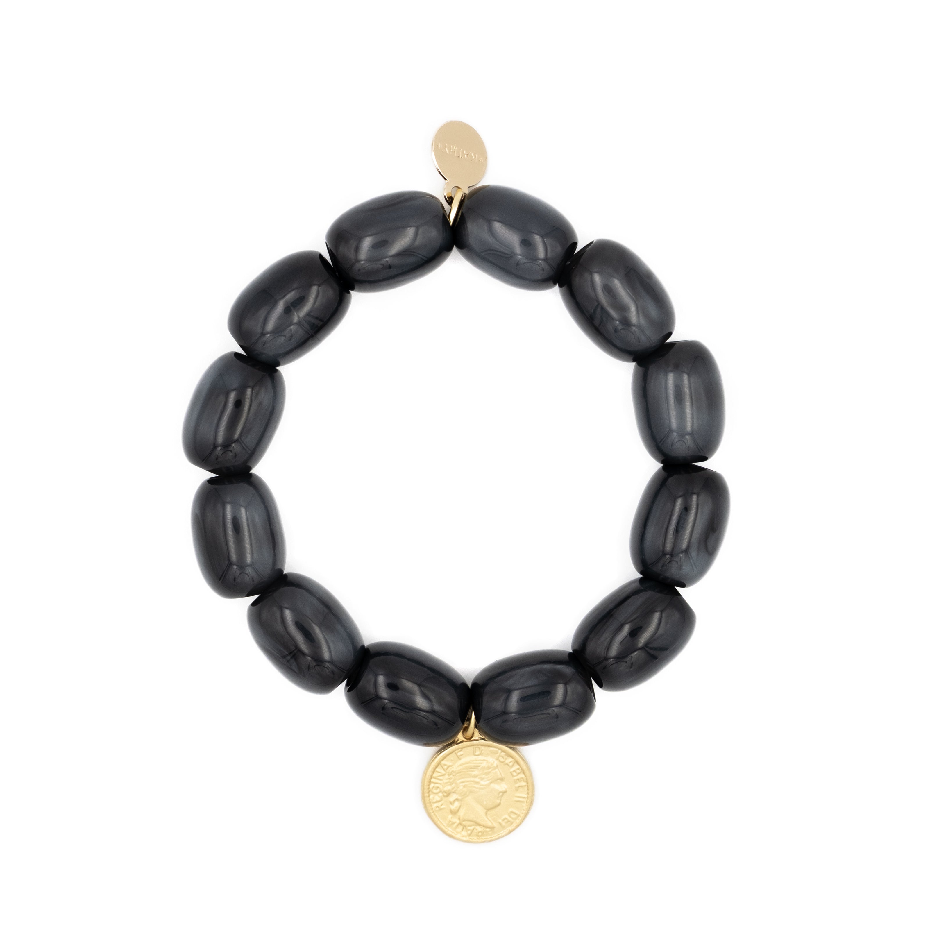 Die dunkel glänzenden Steine in Anthrazit harmonieren perfekt mit dem goldfarbenen Münzanhänger – inspiriert von ikonischen Vintage-Coins.