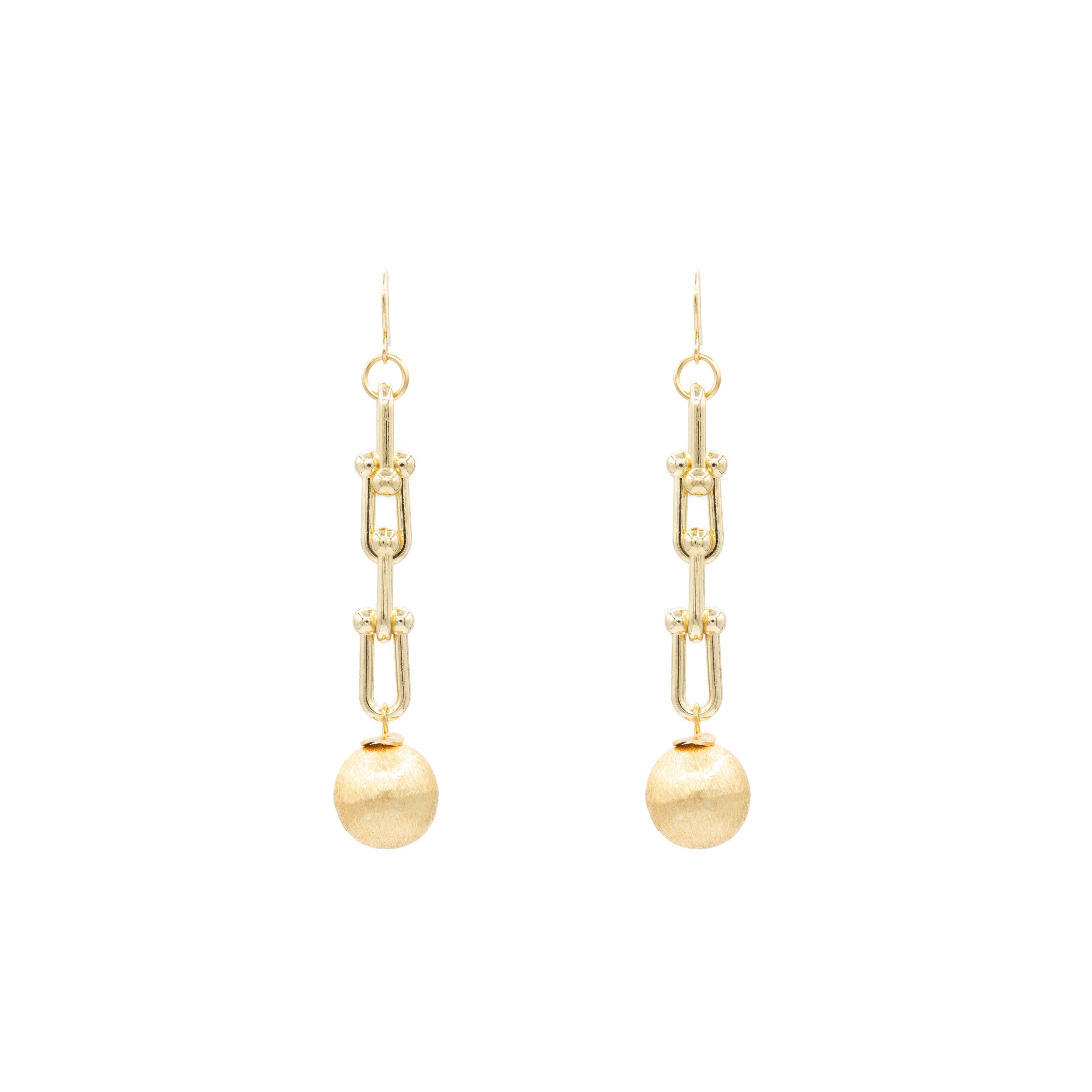 Eleganz in ihrer reinsten Form: Unsere vergoldeten Statement-Ohrringe vereinen zarte Gliederketten-Details mit einer edel schimmernden Kugel. Ein feminines Schmuckstück, das Leichtigkeit und Glamour perfekt verbindet. Ob zum Alltagslook oder Abend-Outfit – diese goldenen Hängerohrringe setzen immer ein Highlight.