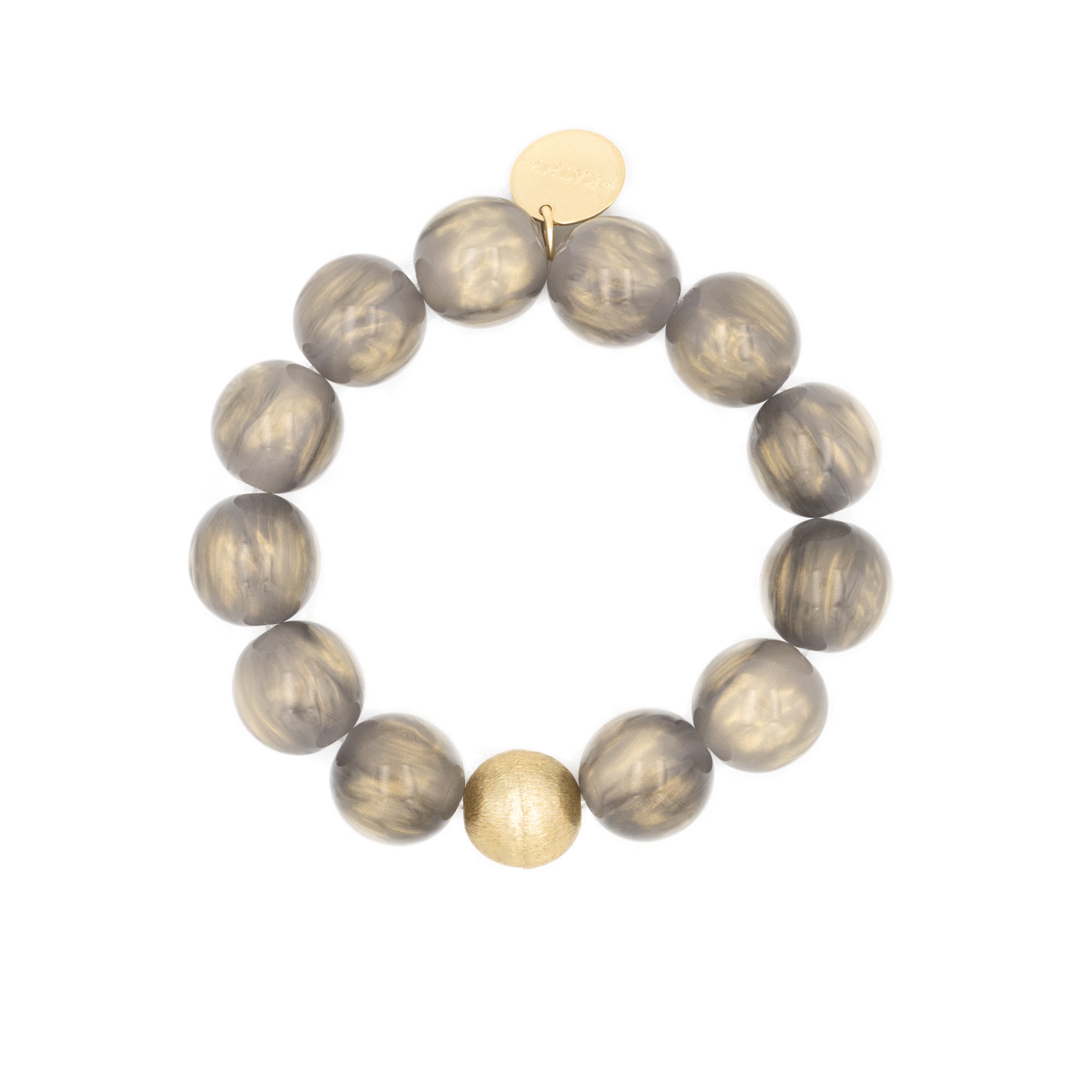 Das Bracelet Oceane von Kathy Jewels verbindet zeitlose Raffinesse mit modernem Statement-Design. Die großen, marmorierten Perlen in Grau mit goldfarbenem Schimmer werden durch eine strukturierte, vergoldete Kugel stilvoll ergänzt. Dank elastischem Band schmiegt sich das Armband elegant an jedes Handgelenk an – ein luxuriöser Begleiter für Alltag und besondere Anlässe.