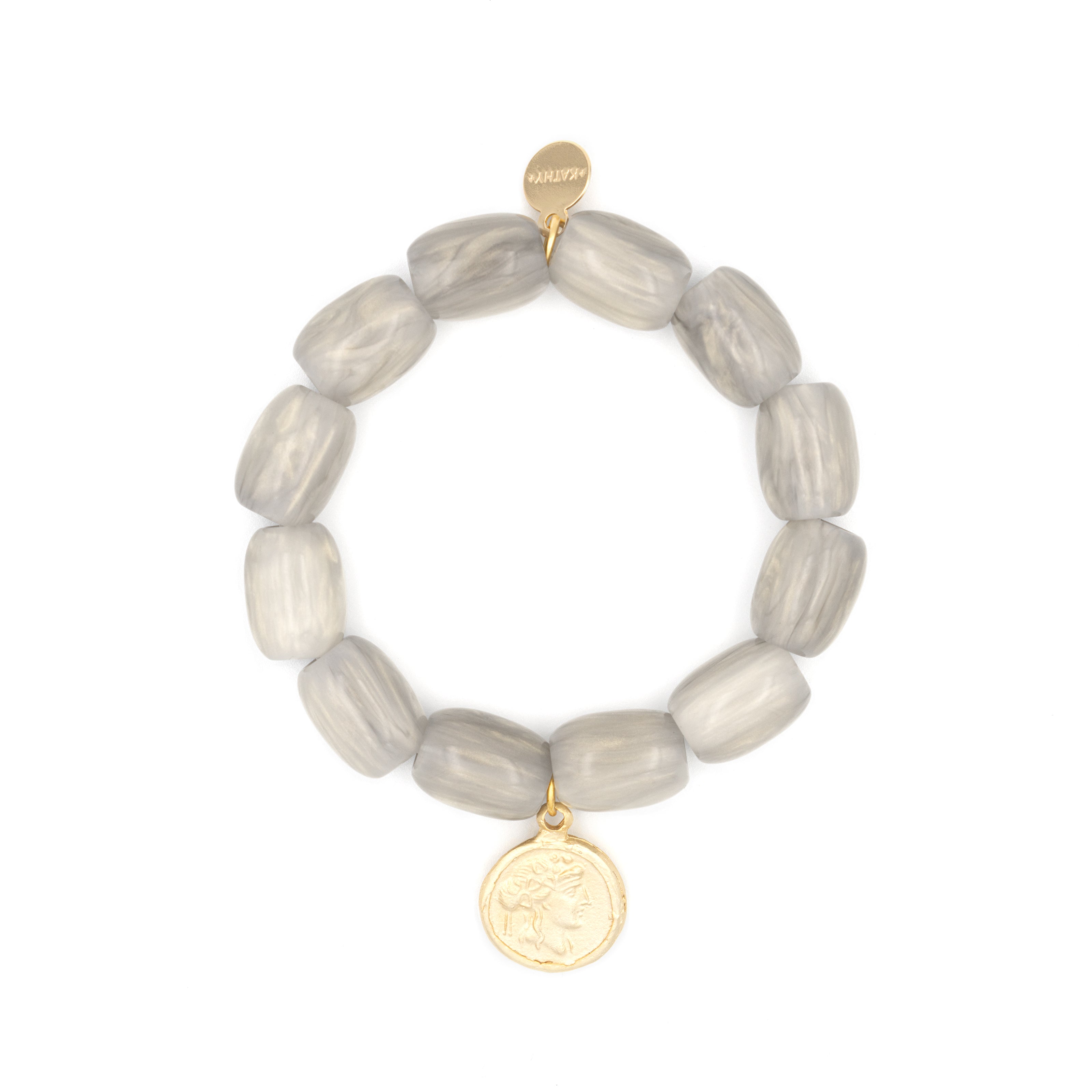 Die handpolierten Resin-Steine in hell marmoriertem Grau schimmern edel im Licht und werden durch den goldenen Münzanhänger stilvoll ergänzt.
